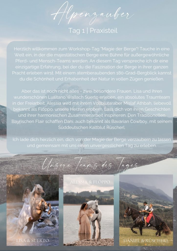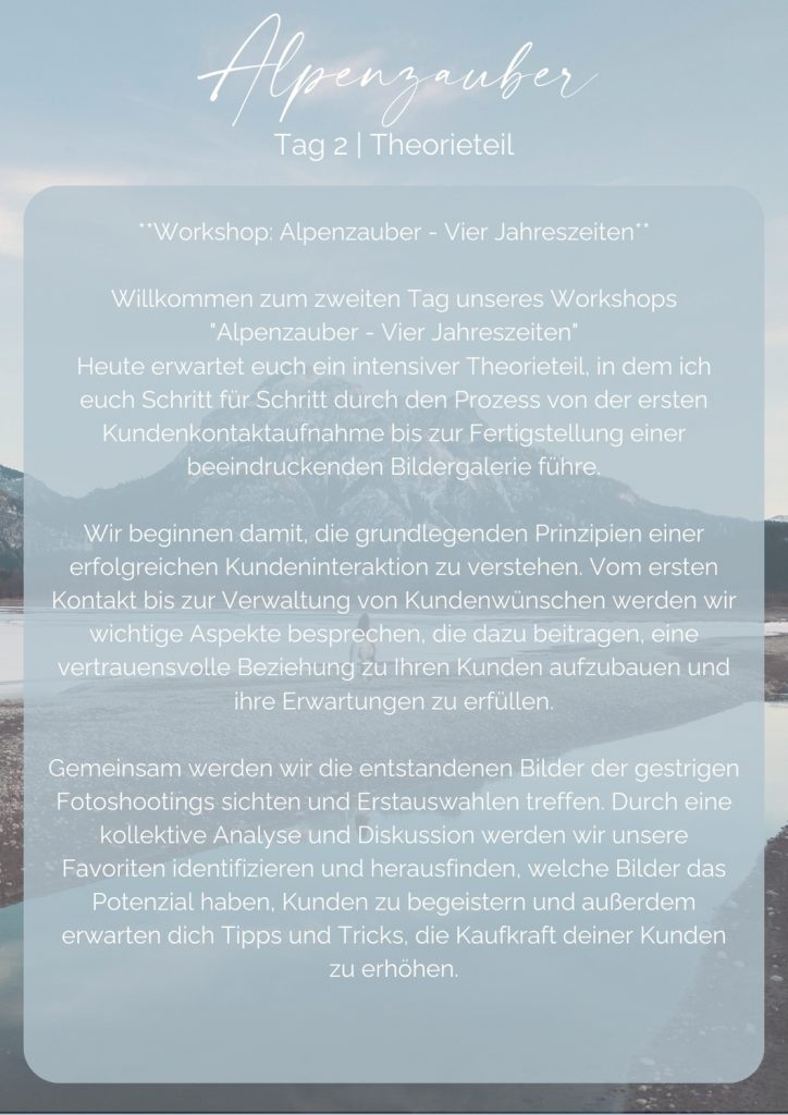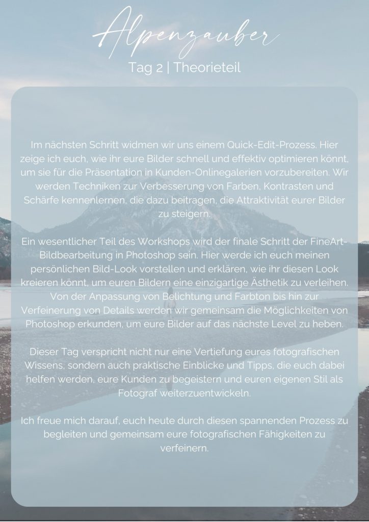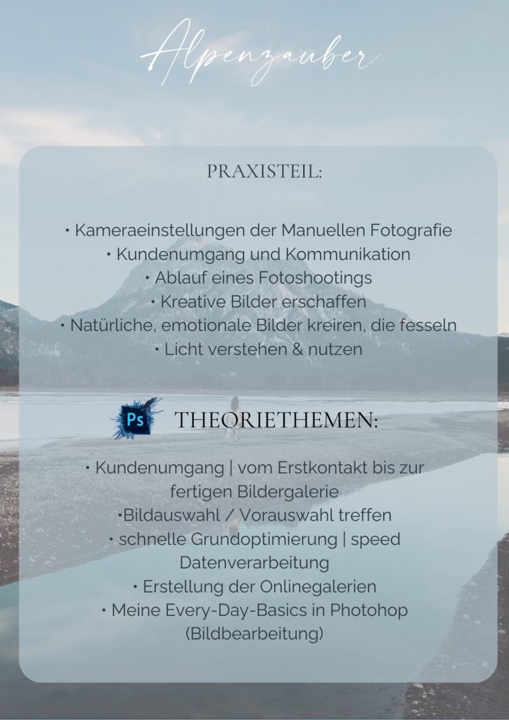 Fotografie Workshop Allgäu | Praxisteile in denen wir gemeinsam fotografieren, Theorieteil in denen ich dir Blicke hinter die Kulissen meiner Arbeit gebe (Bildauswahlen, schnelle Grundoptimierung, Erstellung von Kundengalerien, Photoshop), Handout passend zu den jeweiligen Themen
